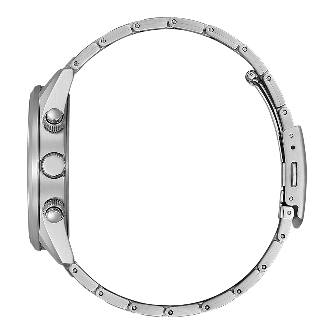 The striking blue dial is equipped with silver-tone hands, index hour markers, and three multifunction sub-dials for 60-second, 24-hour, and dual 1/100th second/day-of-the-week displays. Powered by the advanced Eco-Drive H800 Atomic Timekeeping Radio Controlled movement, it ensures accurate time across multiple time zones without the need for battery replacements.