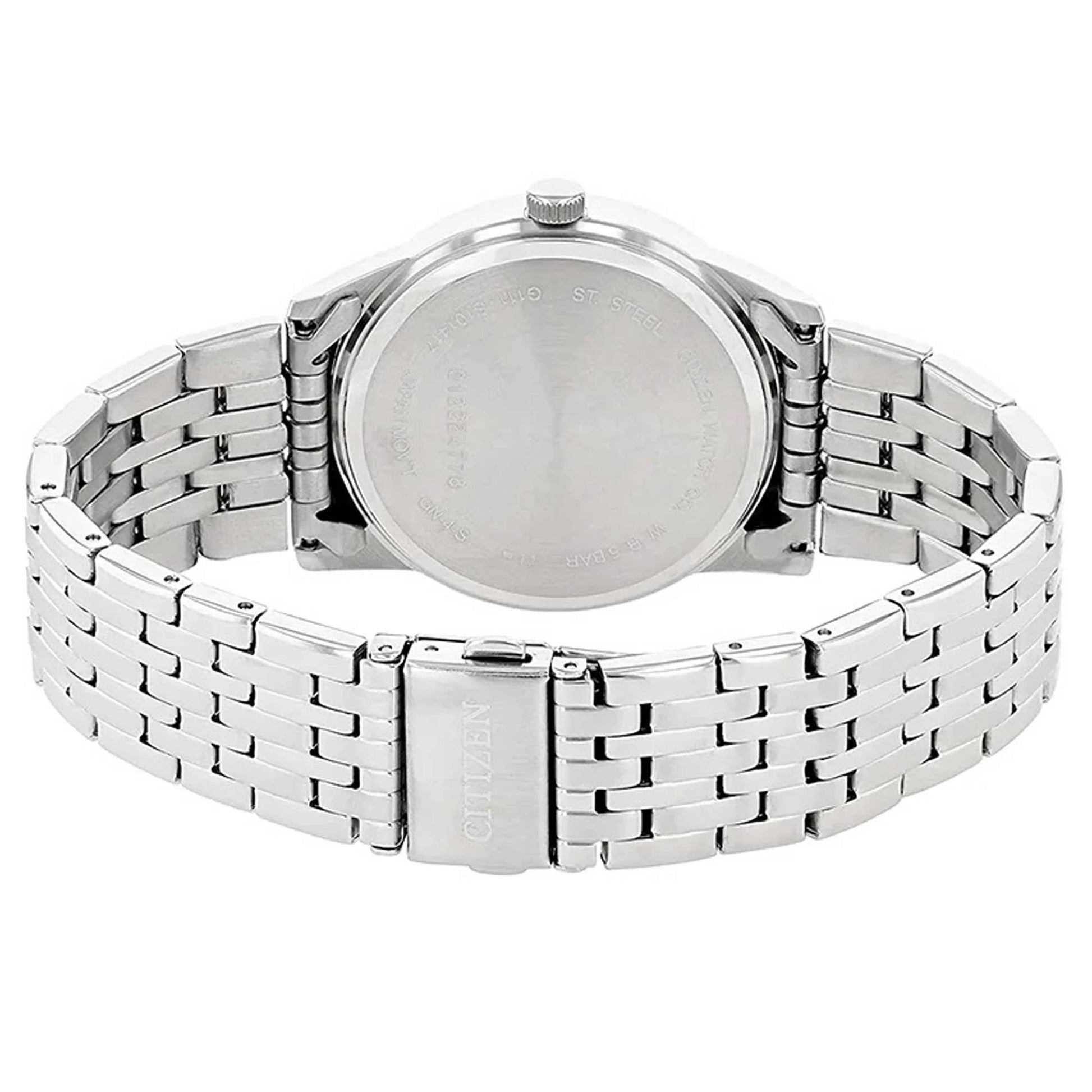 Silver-tone stainless steel case and bracelet with a deployment clasp with push button release. Fixed silver-tone stainless steel bezel. Black dial with luminous silver-tone hands and index hour markers, minute markers around the outer rim. Dial Type: Analog. Luminescent hands. Date display at the 3 o'clock position. Citizen Caliber G111 quartz movement. Scratch resistant mineral crystal. Pull / push crown. Solid case back. Round case shape, case size: 39 mm. Water resistant at 50 meters / 165 feet. Functions include date, hour, minute, second. Casual watch style. Watch label: Japan Movt.