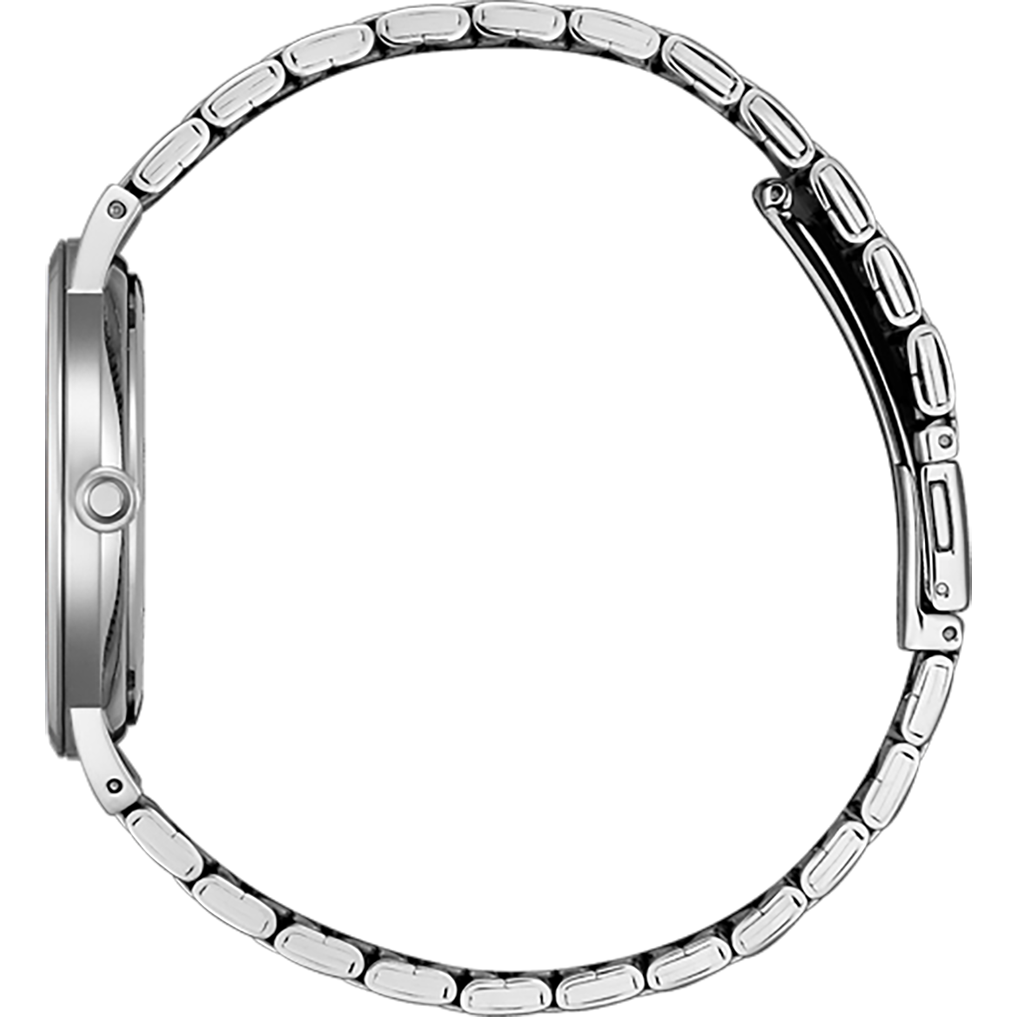 Silver-tone stainless steel case and bracelet. Fixed silver-tone stainless steel bezel. Green dial with silver-tone hands and index hour markers. Minute scale around the inner rim. Dial Type: Analog. Date display at the 6 o'clock position. Citizen Caliber G112-C0Z quartz movement. Scratch resistant mineral crystal. Solid case back. Round case shape, case size: 40 mm. Fold over clasp with a safety release. Water resistant at 50 meters / 165 feet. Functions: date, hour, minute, second. Sport watch style. Watch label: Japan Movt. Citizen Quartz Green Dial Men's Watch BI5120-51X.
