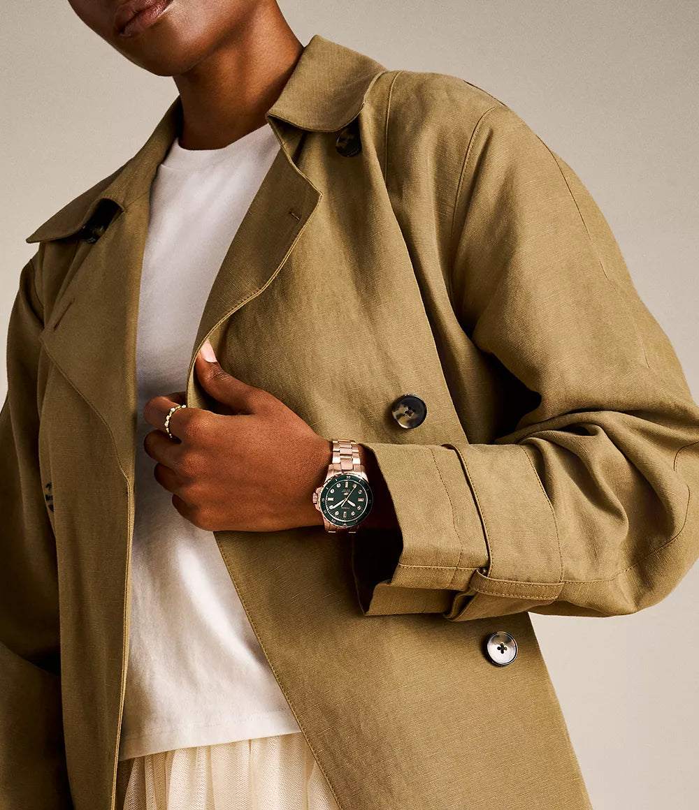 Rose gold-tone stainless steel case and bracelet. Green stainless steel bezel. Green dial with rose gold-tone hands and index hour markers. Minute markers around the outer rim. Dial Type: Analog. Luminescent hands. Quartz movement. Scratch resistant mineral crystal. Round case shape, case size: 36 mm, case thickness: 10 mm. Band width: 18 mm, band length: 7.5 inches. Fold over clasp with a safety release. Water resistant at 100 meters / 330 feet. Functions: hour, minute, second. Blue Dive Series. Sport watch style. Watch label: Japan Movt. Fossil Blue Dive Quartz Green Dial Ladies Watch ES5371.