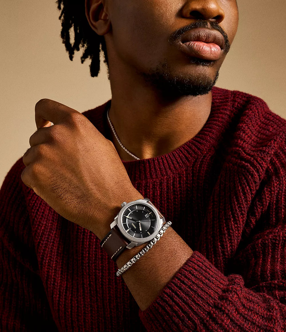 Silver-tone stainless steel case with a brown leather strap. Fixed silver-tone stainless steel bezel. Black dial with silver-tone hands and index hour markers. Minute markers around the outer rim. Dial Type: Analog. Quartz movement. Scratch resistant mineral crystal. Pull / push crown. Solid case back. Round case shape, case size: 42 mm. Band width: 22 mm. Buckle clasp. Water resistant at 50 meters / 165 feet. Functions: date, hour, minute, second. Machine Series. Casual watch style. Watch label: Japan Movt. Fossil Machine Quartz Black Dial Ladies Watch FS6081SET.