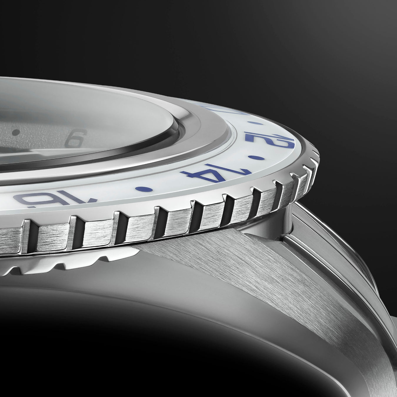 The uni-directional rotating bezel in two-tone silver and blue pairs seamlessly with luminous hands and markers, ensuring clarity in low-light conditions. The robust Caliber 9S86 automatic movement offers a 55-hour power reserve, ensuring lasting accuracy wherever your journey takes you.