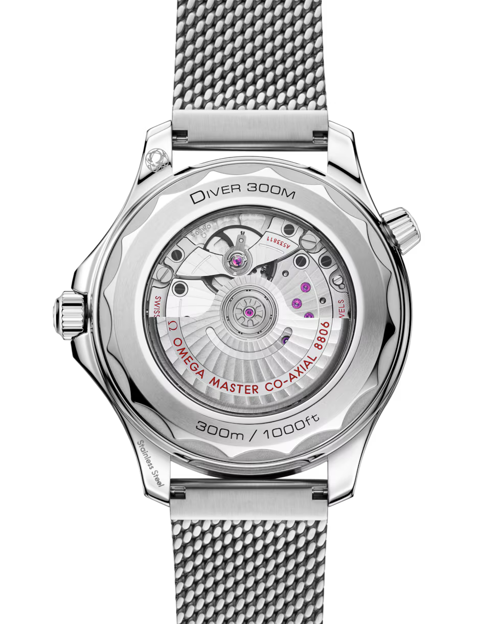 Its black dial with silver-tone hands and luminous index markers ensures superior legibility under any condition. At its heart lies the Omega Calibre 8806 — a self-winding movement with co-axial escapement and a 55-hour power reserve, delivering precision and durability certified by chronometer standards.
