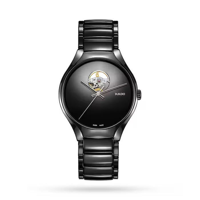 The Rado True Secret R27107152 exemplifies understated luxury and exceptional craftsmanship. Encased entirely in black high-tech ceramic, this timepiece radiates modern elegance and durability. Its transparent see-through case back reveals the precision of the automatic movement — a signature of Swiss watchmaking excellence.