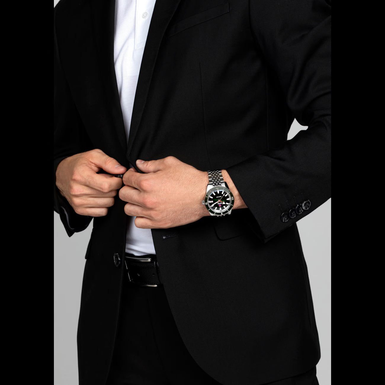 The silver-tone stainless steel bracelet with a fold-over clasp and push-button release ensures secure comfort on the wrist. Combining Swiss precision, refined style, and sporty resilience, this Captain Cook model is a perfect everyday companion for modern gentlemen.