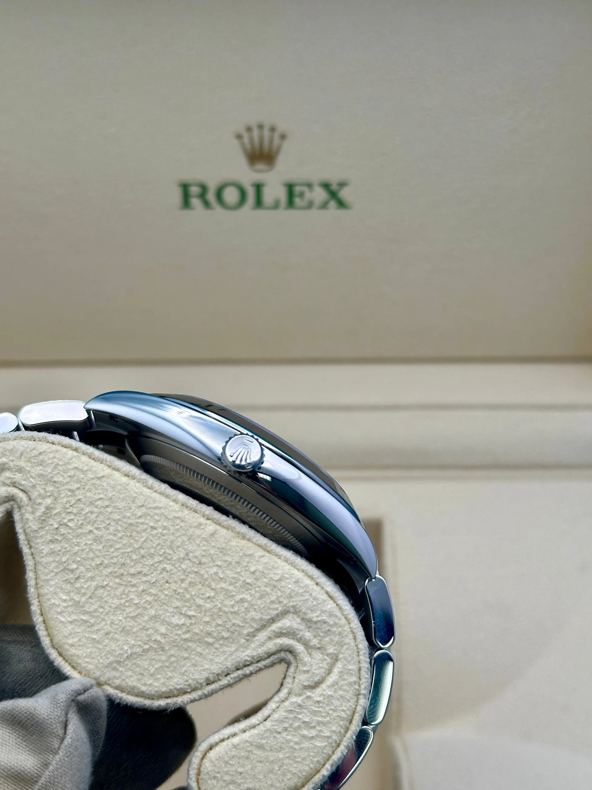 The crisp white dial is enhanced by silver-tone hands and bold Roman numeral hour markers, with luminous accents for legibility in low light. A practical date window at 3 o'clock keeps you on schedule, while the Rolex Calibre 3235 automatic movement ensures high-precision timekeeping with a 70-hour power reserve.