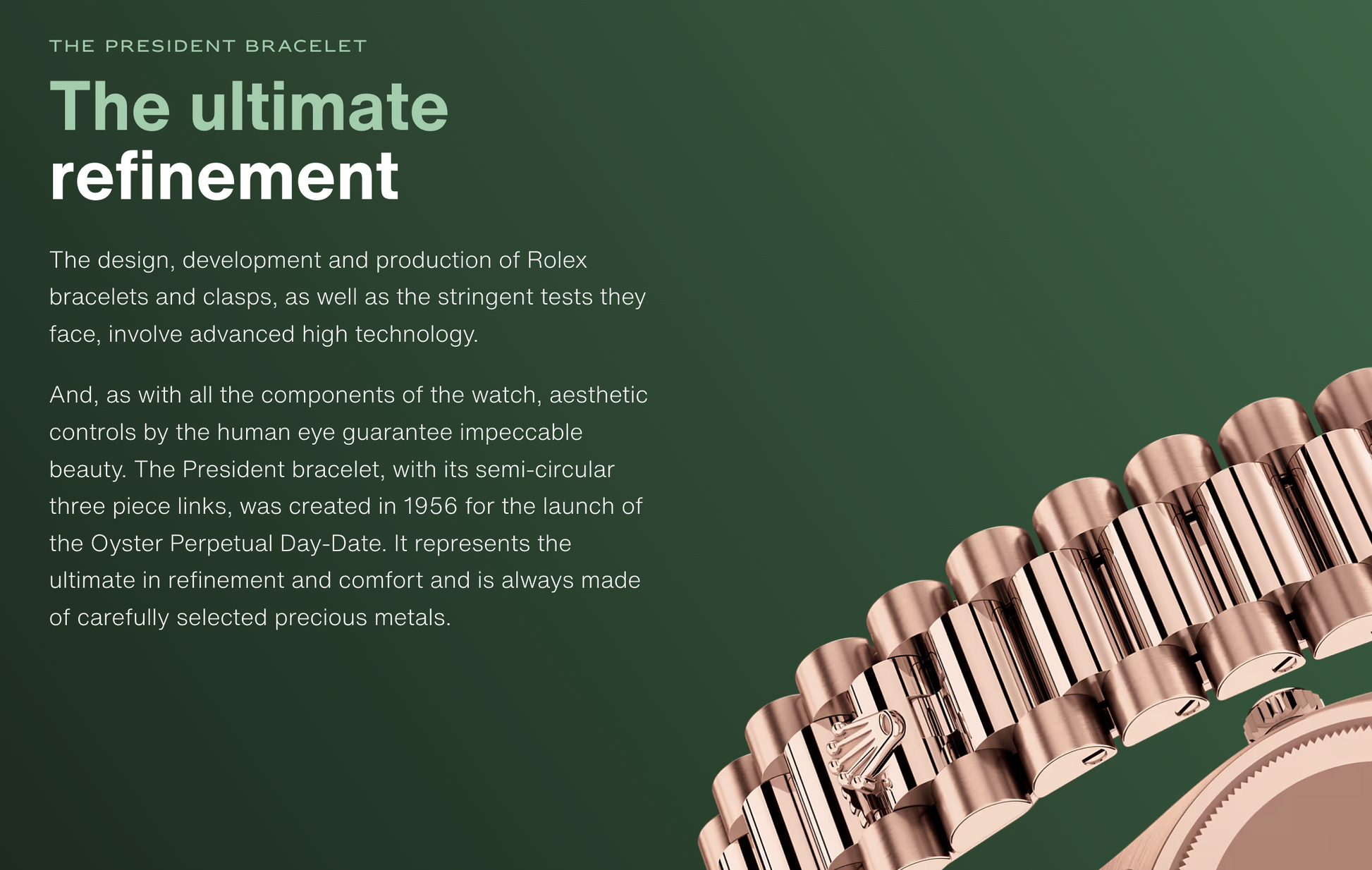 Equipped with the Rolex Caliber 3255 automatic movement, this chronometer-certified timepiece delivers elite precision, a 70-hour power reserve, and resistance to shocks and magnetic fields. Its timeless President bracelet, exclusive to the Day-Date collection, offers unmatched comfort and regal presence.