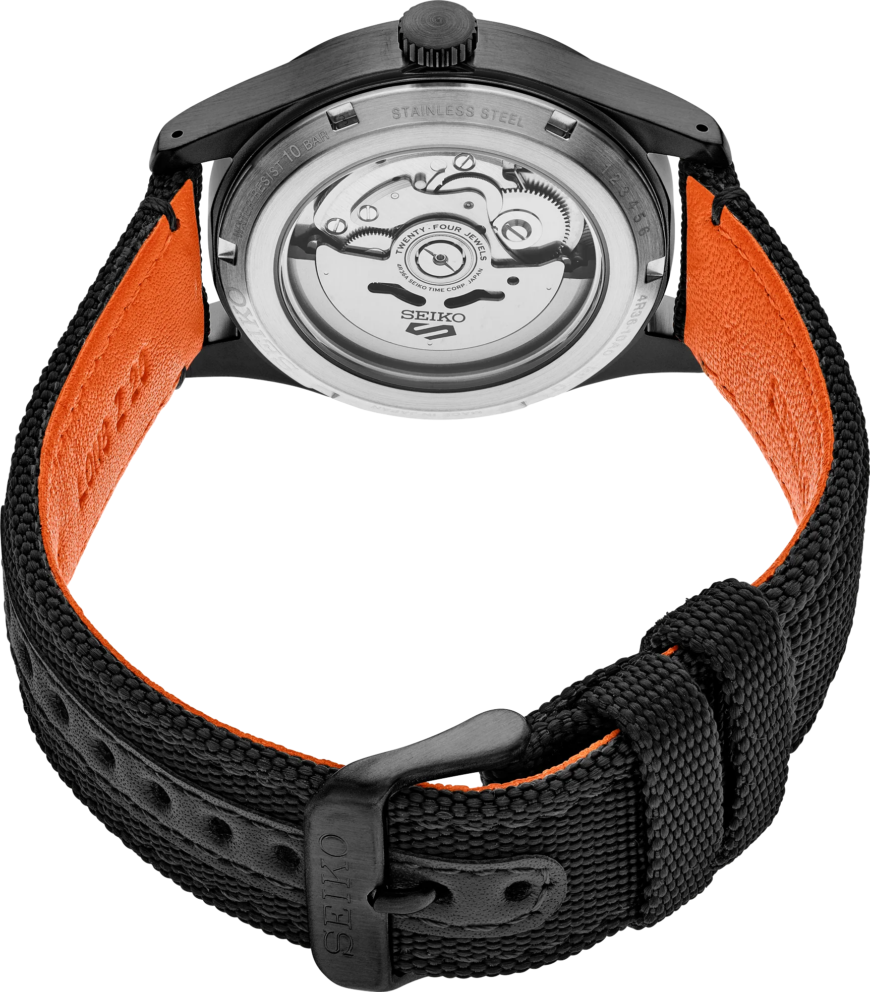 Black-plated stainless steel (hard coating) case with a black nylon strap. Fixed black-plated bezel. Black dial with luminous orange hands and Arabic numeral hour markers. Arabic numeral minute markers (at 5-minute intervals) and minute markers around the outer rim. Dial Type: Analog. Luminescent hands and markers. Day of the week and date display at the 3 o'clock position. Seiko caliber 4R36 automatic movement, containing 24 jewels, beating at 21,600 vph, and has a power reserve of approximately 41 hours. Scratch-resistant Hardlex crystal. Pull/push crown. Transparent case back. Round case shape, case size: 39.4 mm, case thickness: 13.2 mm. Band width: 20 mm. Tang clasp. Water resistant at 100 meters / 330 feet. Functions: date, hour, minute, second. 5 Sports Series. Military watch style. Watch label: Japan Movt. Seiko 5 Sports Automatic Black Dial Men's Watch SRPH33K1.