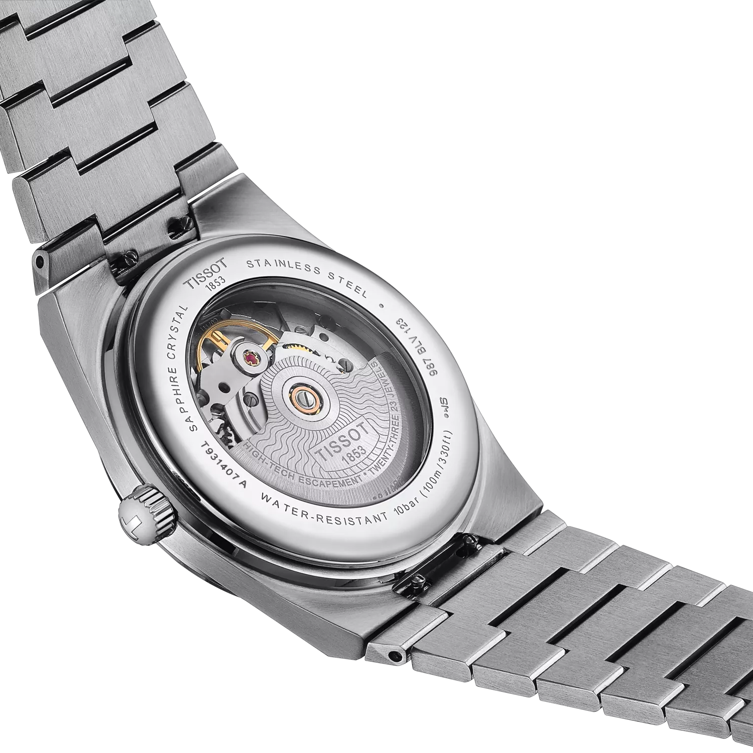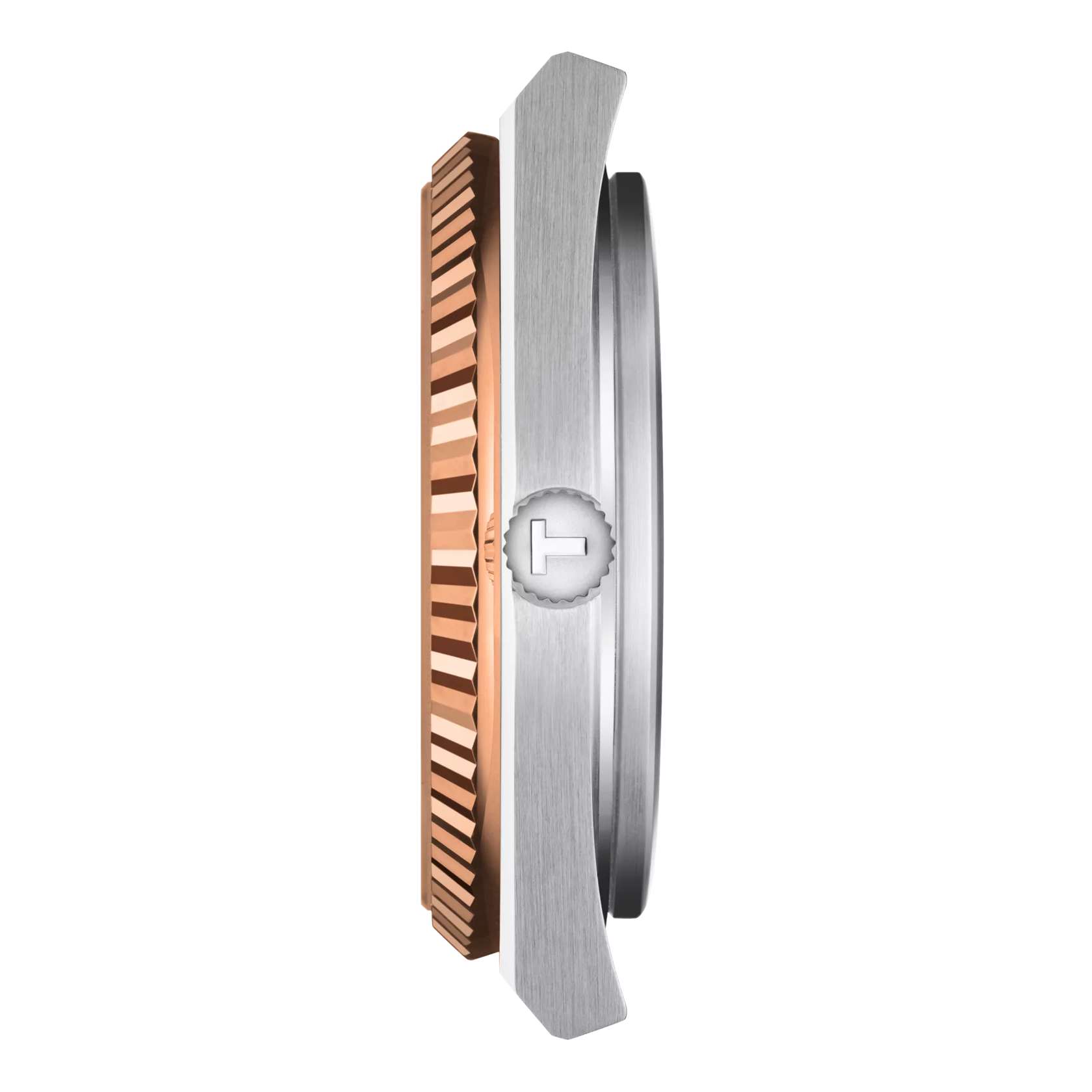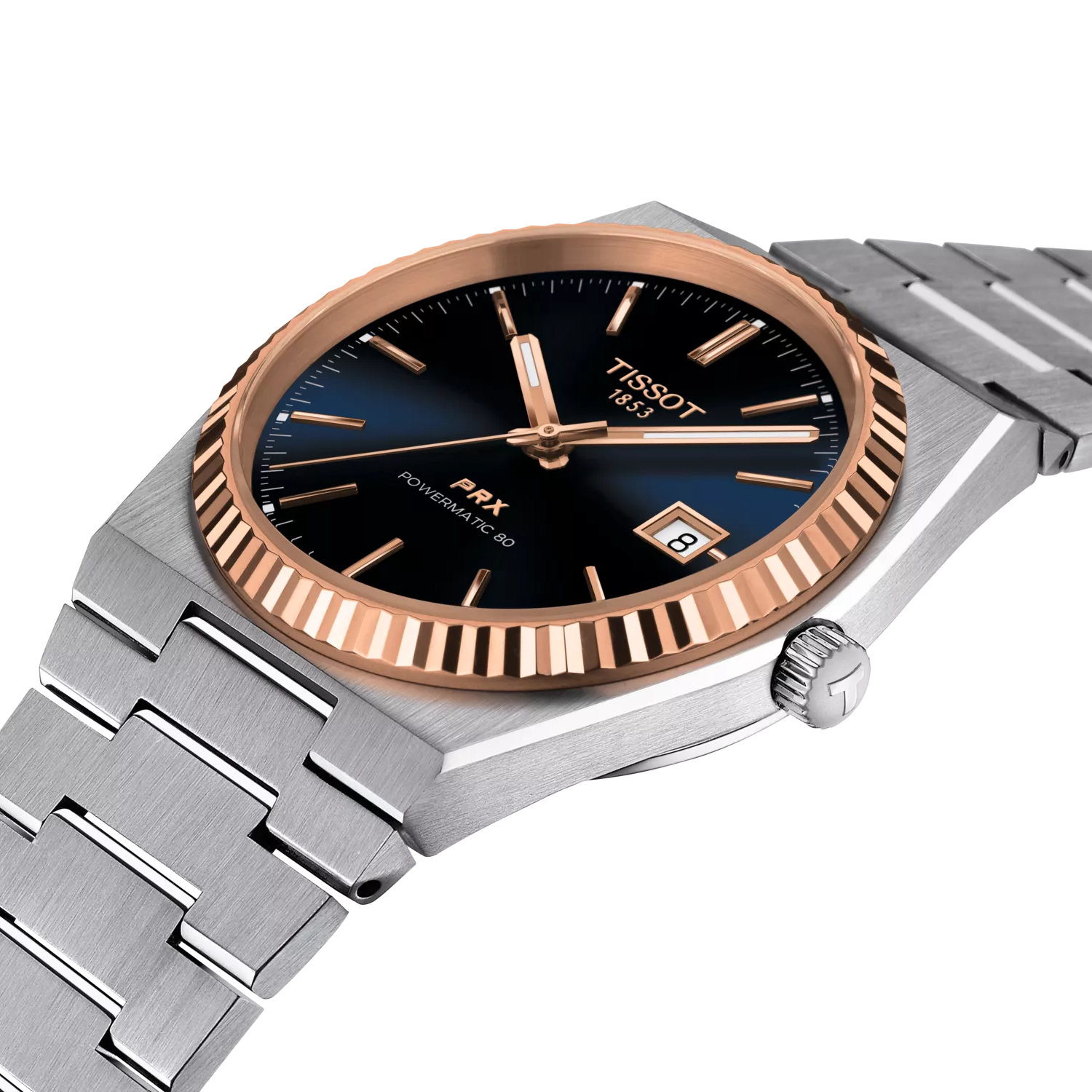The Tissot PRX Powermatic 80 T931.407.41.041.00 blends bold retro design with modern precision. Its sleek 40 mm tonneau-shaped case in 316L stainless steel is accented with an exquisite fluted 18kt rose gold bezel, giving the watch a refined two-tone presence that turns heads.