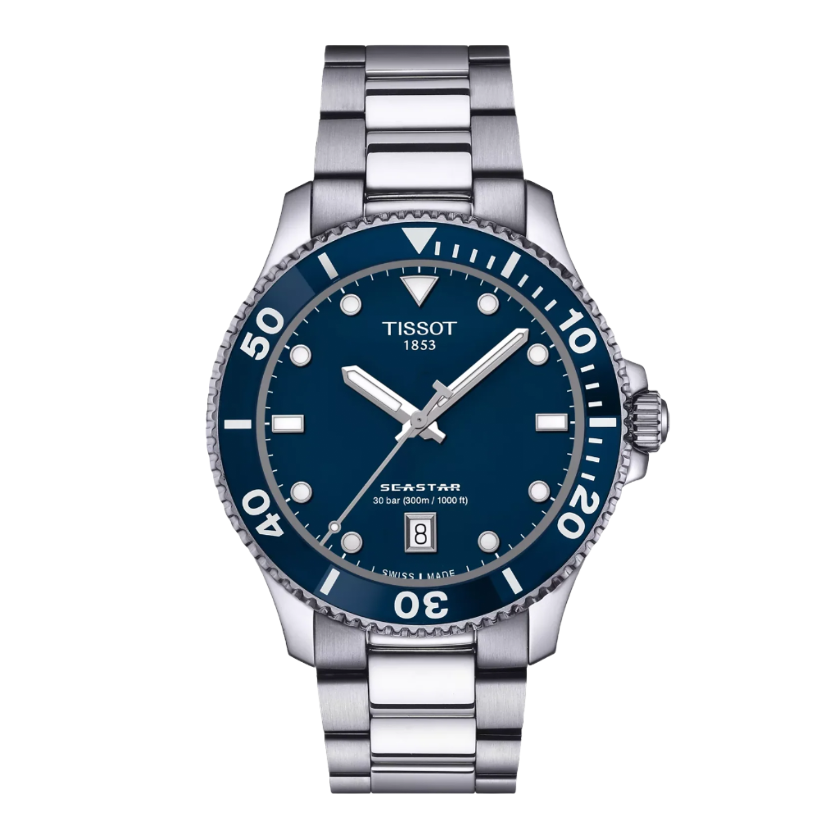 The Tissot Seastar T120.410.11.041.00 blends refined Swiss craftsmanship with the robust reliability of a professional dive watch. With a streamlined 40 mm stainless steel case and a vivid blue dial, it’s built for precision and impact both underwater and above.
